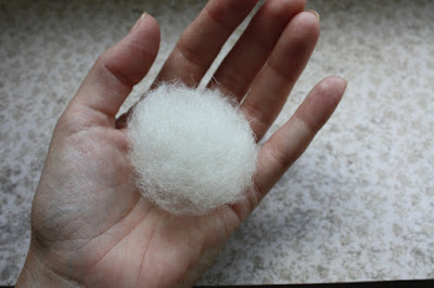 1. Take a bit of wool and shape into a roundish shape. Dip into a hot, soapy water and pressing lightly, begin to make it round, using both hands.