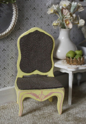 This tiny rococo style chair is made using 3 mm thick balsa wood and it has leather cushions.