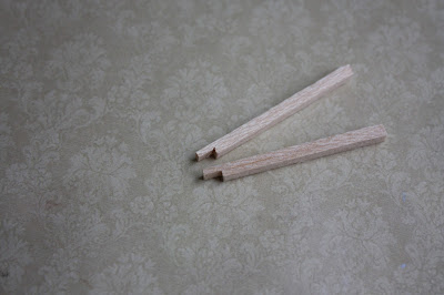 7. Sand the handle (3,3 cm x 4 mm) lightly into a round shape. Carve off tiny bits of balsa, 2 mm from both ends, leaving only a tiny 1 mm thick and 2 mm long spike in both ends.