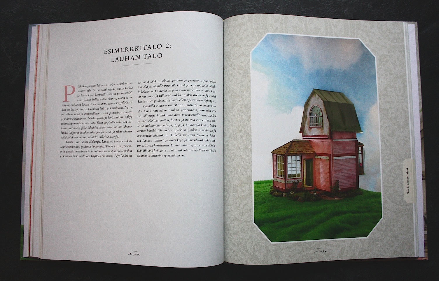 Jos jostakin kirjan kannesta saa inspiraatiota omiin askarteluihin niin tämä ihana kansi on kyllä yksi niistä! Kuvassa komeilee Moreenin kustantama Pienenpieniä käsitöitä, joka on nukkekotiharrastaja Hanna Merosen toinen kirja. Enimmäinen ihanuus, Tee itse nukketalo, oli niin ikään upea ilmestys ohjeineen ja kuvineen. Kirjan esittelin pari vuotta sitten blogissani ja esittelyyn pääset tästä.