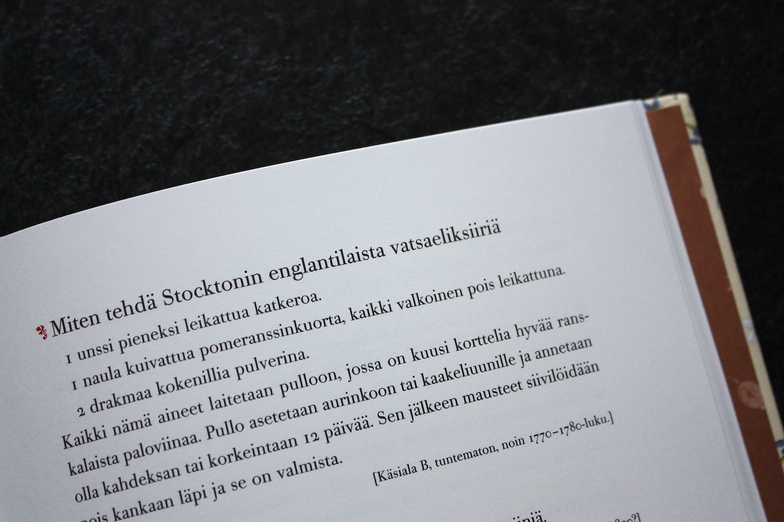 Nyt esittelyyn pääsee Suomalaisen Kirjallisuuden Seuran (SKS) kustantama, mielestäni todella mielenkiintoinen kirja. Talousreseptikirjan myötä pääsee syvälle 1700- ja 1800- luvun keittiöön ja tarkemmin Louhisaaren linnaan. Mutta ei kirja pelkästään ruokaohjeita sisällä vaan se pitää sisällään myös erikoisiakin hoito-ohjeita niin ihmisten kuin kotieläinten vaivoihin.