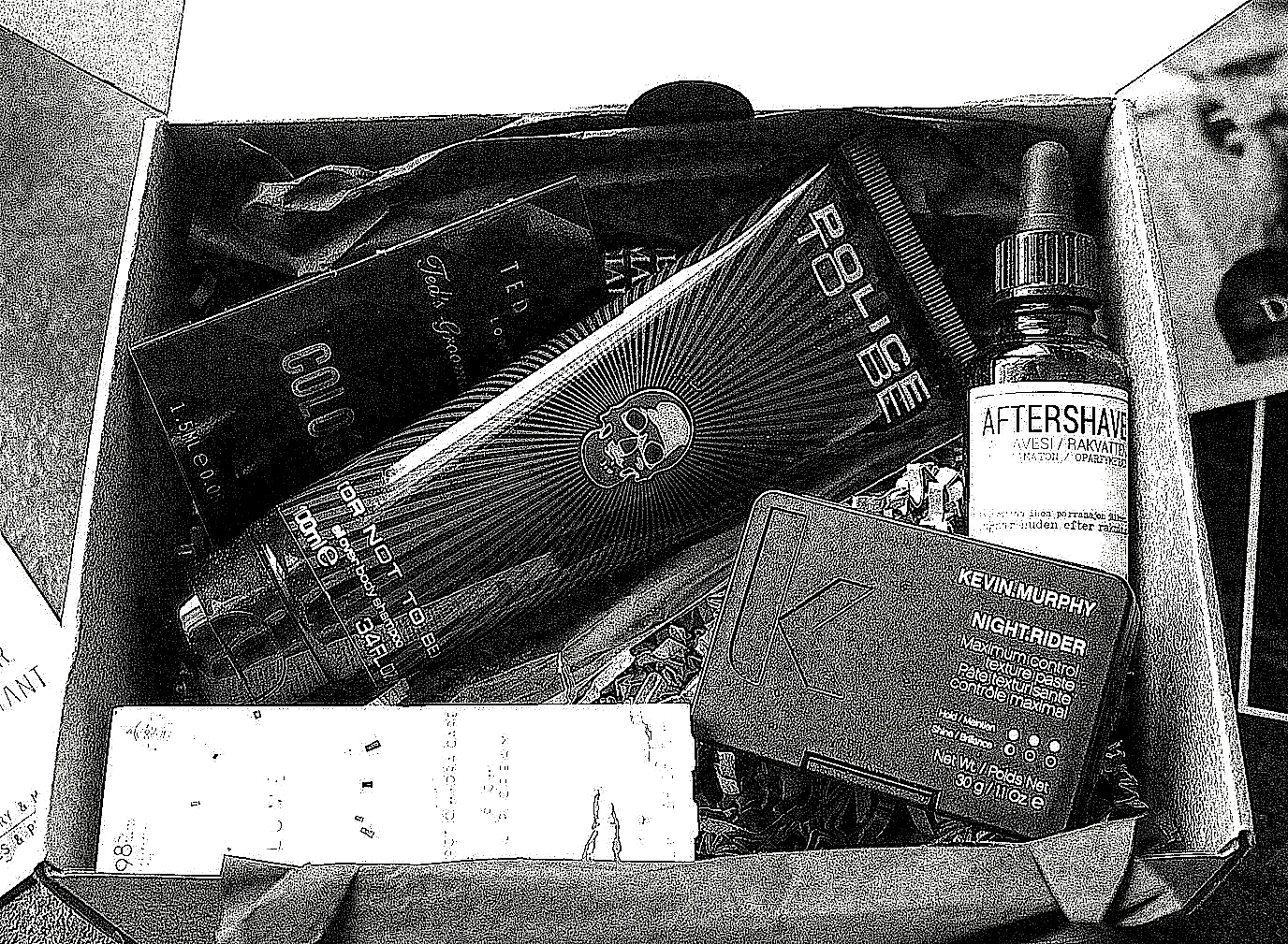 Bettebox For Men -kosmetiikkaboksin sisältöä. Vasemmalta oikealle... testit Ted Bakeriltä, Sport & Sauna virkistävä mattaseerumi by Dermosil, Shave Club aftershave, Lumene ARKTIS tehokosteuttava & rauhoittava huulivoide, Kevin Murphy Night Rider -hiusvaha, Happy Smile Adults Manual hiilikuituhammasharja (!), Police To Be -suihkugeeli sekä Ted Bakerin testeri: tuoksunäyte.