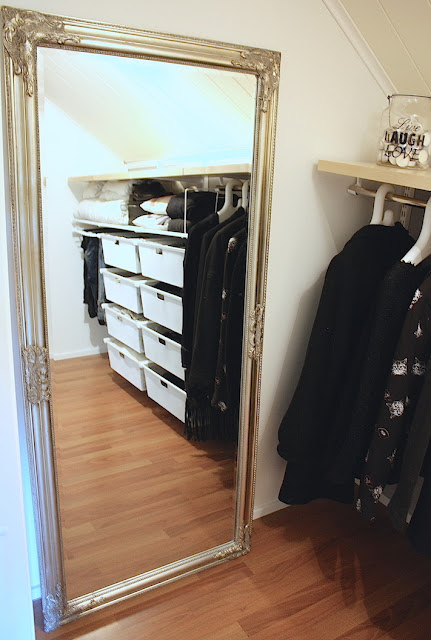 Vaatekaappimme sisällä pystyy normaalisti seisomaan. Tietysti ei kovin kauas ole tarvinnut oviaukosta eteenpäin kulkea, kun pää jo kopsahtaa kattoon. Tuon pitkän seinän leveys on 280 cm ja korkeutta tuossa seinässä on 145 cm.  Sivuseinät ja vieläpä vinot sellaiset ovat niin haasteelliset sisustaa... leveyttä on 145 cm ja korkein kohta lattiasta kattoon on 250 cm. Tila ei yksinkertaisesti ole riittänyt vaikka olemme hankkineet erilaisia hyllyjä ja rekkejä tavaroita sekä vaatteita varten. Mutta tähän tuleekin pian muutos ja niin kaivattu sellainen... nimittäin ihka oikea säilytysjärjestelmä ja ihan meidän oman vaatekaapin omille mitoille suunniteltuna! Pysyhän kuulolla! I ♥ Elfa!