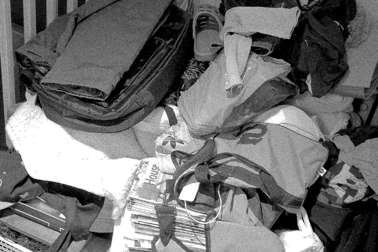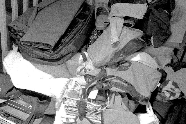 Nyt sitten ne silmät kiinni... tulee nimittäin karmea totuus. Totuus meidän vaatehuoneesta, joka on tuntunut olevan "pohjaton". Vaatehuoneemme on elänyt tässä vuosien mittaan jollakin kummalla tavalla aivan kuin omaa elämäänsä. Välillä pursuten tavaraa niin, että sieltä ei ole löytänyt ikinä mitään ja välillä taas järjestelyn jälkeen hiukan siistimpänä hetken aikaa, kunnes taas pian on ollut hirviömäisen näköinen. Kuvassa iso kasa kaikkea mahdollista vaatehuoneen tavaraa odottamassa "inventaariota".