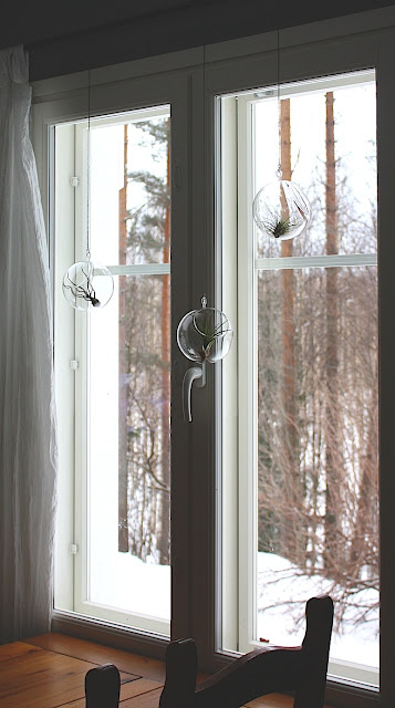 Kiinnitin lopulta lasipallot ohuisiin, metallisiin ketjuihin, joista kaikista tein hiukan eripituiset. Näin sain ikkunan eteen tulevaan asetelmaan myös elävyyttä. Pallot ovat mielestäni aivan täydellisen kokoiset näille ilmakasveille - ja muodollisesti niin yksinkertaiset... tykkään! Ilmakasvit eivät muuten pidä auringon paahteesta, joten kannattaa omalle asetelmalle valita sellainen ikkuna, johon paiste ei porota.