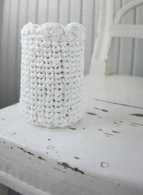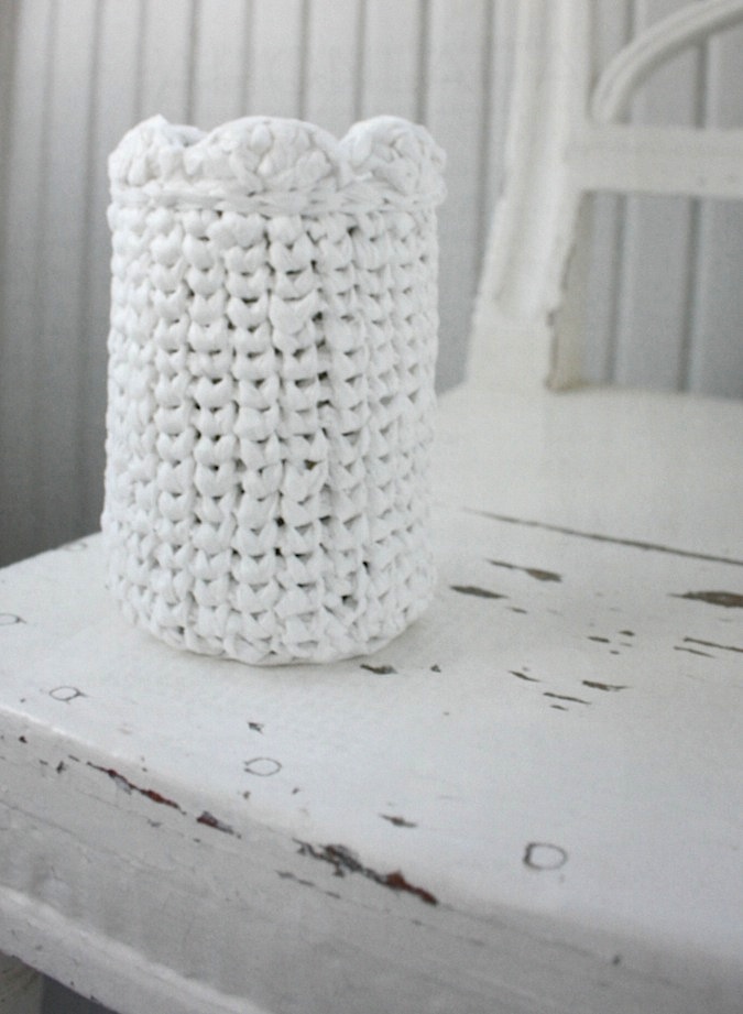 Plastiikki on muovia ja kirjan ohjeilla voi valmistaa mitä ihanampia virkkaustöitä esimerkiksi kaupan muovipusseista ja muusta vastaavasta materiaalista. Muovipussimateriaali leikataan pitkänomaisiksi nauhoiksi ja niistä muodostuu vaikka mitä, kuten kuvassa komeileva pieni kaunis kori, jota voi käyttää mm. kynätelineenä.