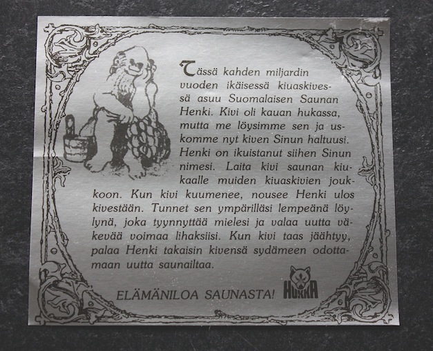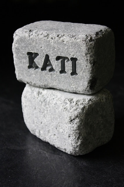 Löysin Hukka Designin (...muuten tosi toimivilta) nettisivuilta aivan ihanan uutuustuotteen, nimikiven. Nimikivi on erikoiskiuaskivi, johon kaiverretaan itselle mieluinen teksti. Kaiverrus voi olla melkeimpä mitä vain ja myös erikoismerkkejä ja numeroita voi pyytää, perinteisten kirjainten lisäksi. Kiven juju on siinä, että löylyä heittäessä, vesi jää hetkeksi kaiverruksen syvennyksiin ja nimi näkyy tummana kiukaalla.